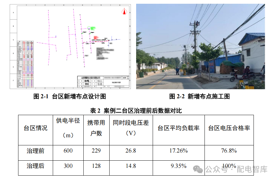 案例二:某某台区下辖低压用户 229 户,系统监测 5 月 30日同时段电压差超过 26.8 V,台区负载率 17.26%,经研判确定为供电半径过长。现场核实变压器供电半径 600 m,储备新增布点项目,新增 200 kVA 配变一台,实施后供电半径缩短为 300 m,台区电压恢复正常。